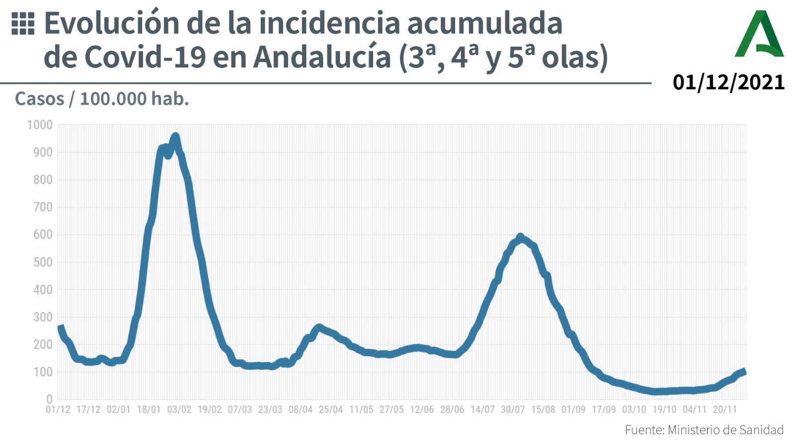 Andalucía registra este jueves 2 de diciembre un total de 1.226 contagios de coronavirus en 24 horas, la cifra más alta desde principios de septiembre, con 1.298 casos el día 6, lo que supone, además, más que los del miércoles (868) y más que los del jueves pasado (983), y contabiliza cuatro nuevos fallecidos, frente los cinco de ayer y los dos de hace una semana.