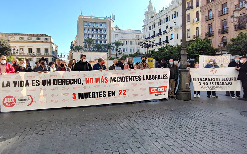 Los sindicatos UGT y CCOO se han vuelto a concentrar hoy en la Plaza de las Tendillas de Córdoba para mostrar su pesar por los dos últimos trabajadores fallecidos a causa de la siniestralidad laboral en la provincia, la de un camionero de 60 años y la de un trabajador de una fábrica de Lucena, de 36 años. En lo que va de año son ya 3 las víctimas mortales fruto de esta lacra, lo que sitúa a Córdoba como la provincia andaluza con más muertes por accidente laboral en 2022.